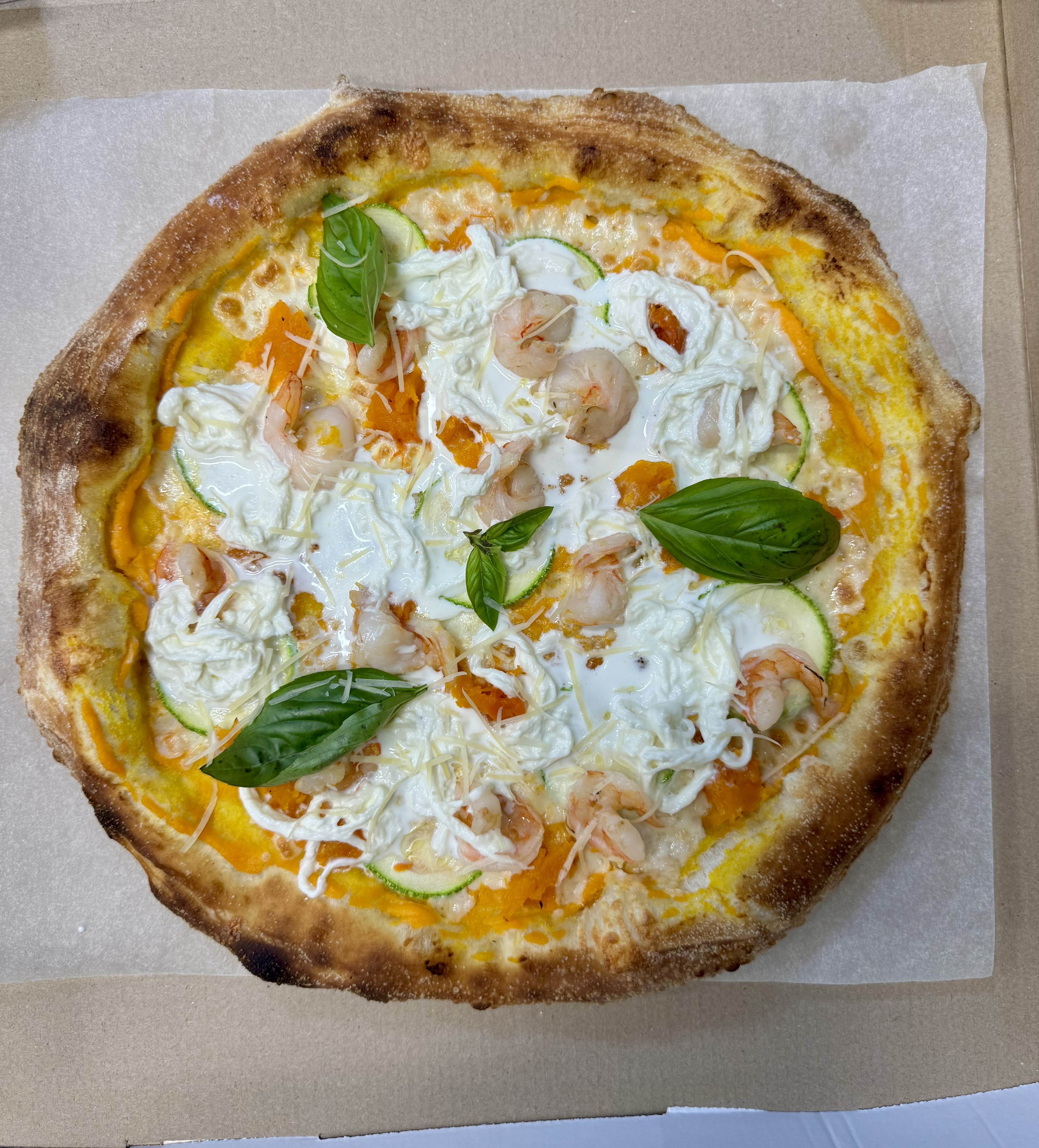 Тыквенный соус со сливками, сыр моцарелла, креветки, кабачок, печёная тыква, сыр страчателла, пармезан, базилик, оливковое масло.