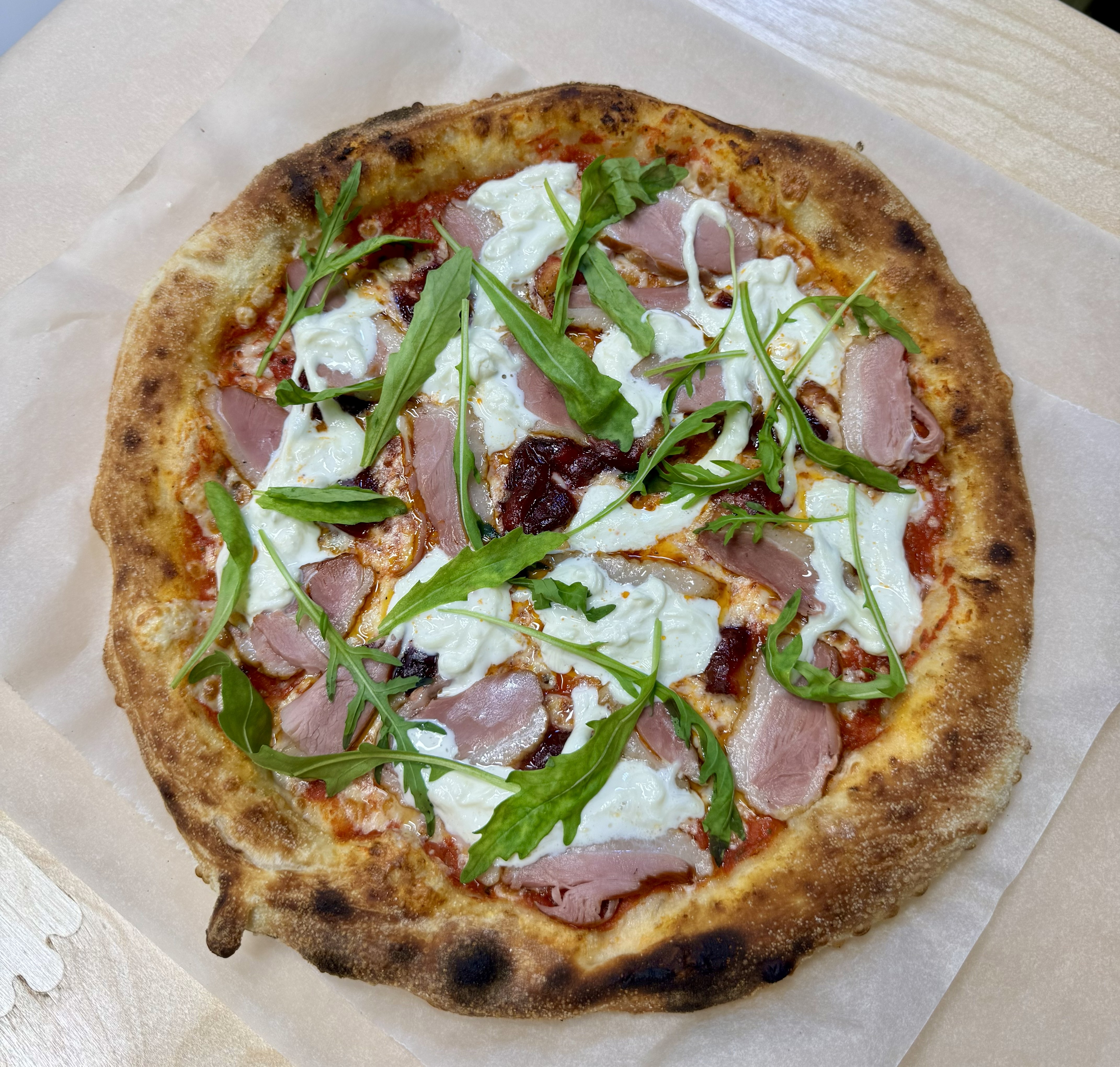 Томатный соус, сыр моцарелла, копчёная утиная грудка, печёная слива, сыр страчателла, пармезан, руккола, оливковое масло.