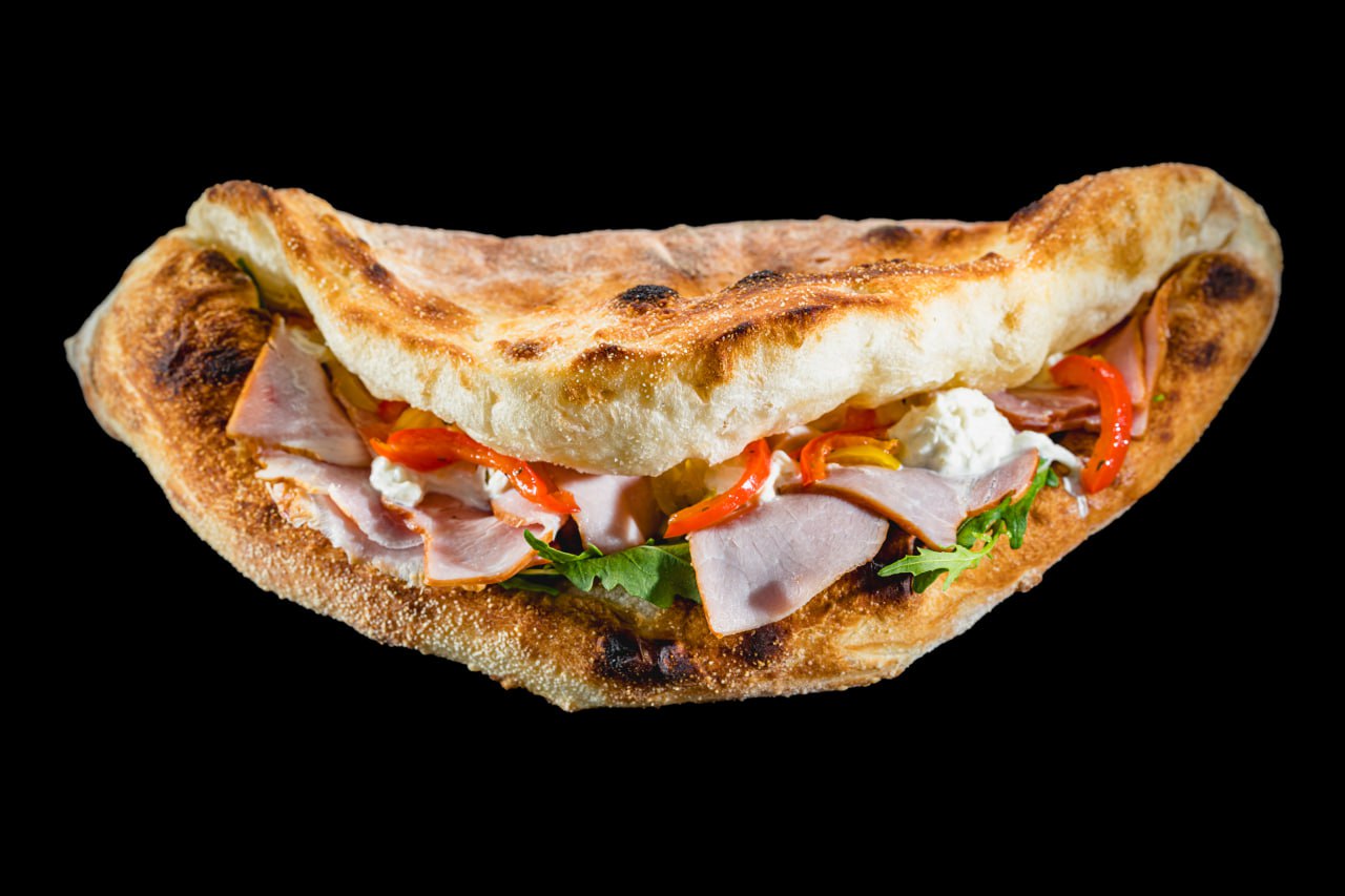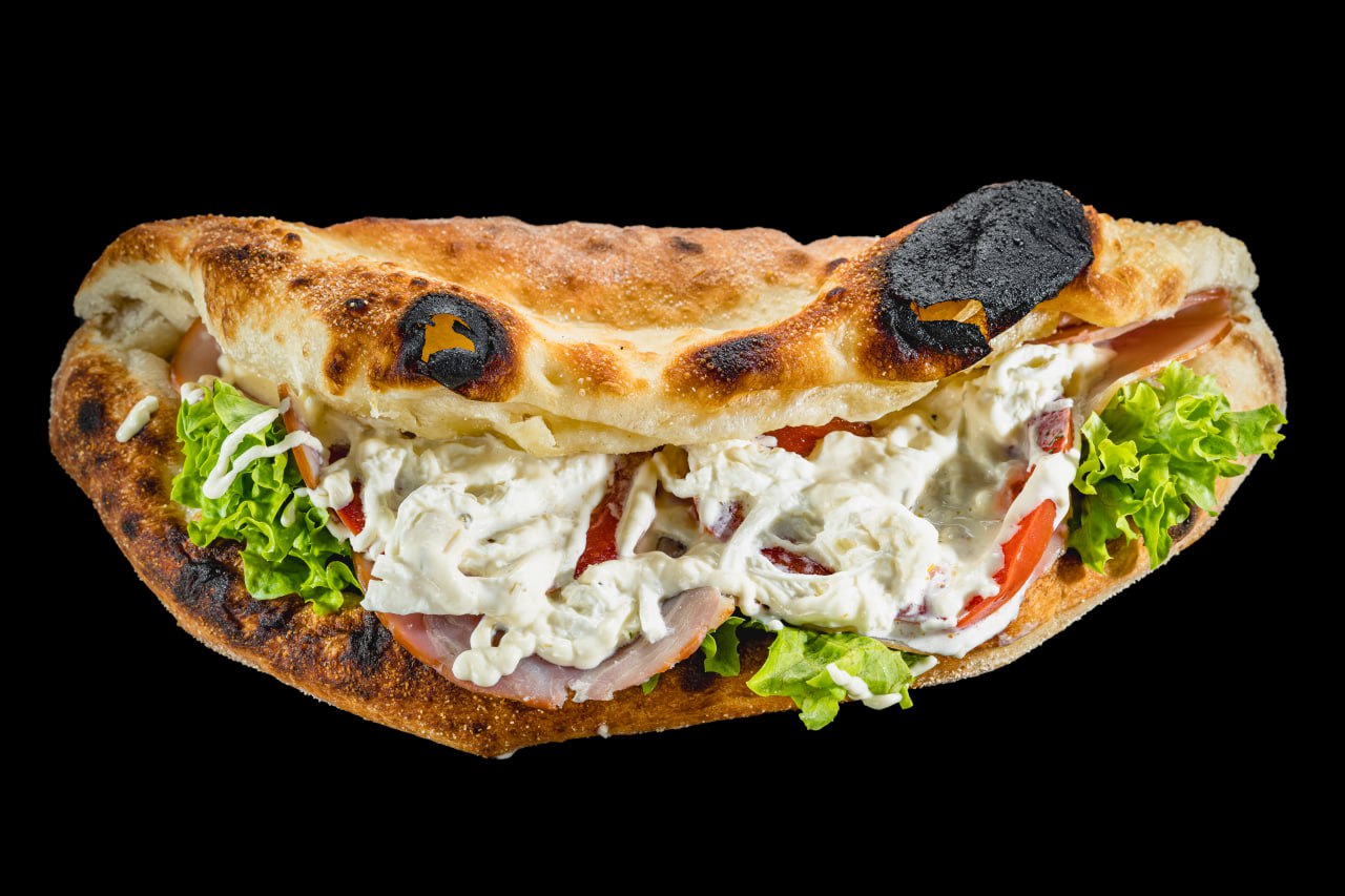 Соус Айоли, куриная ветчина, печёный помидор, лист салата, сыр моцарелла, сыр страчателла, чесночное масло.