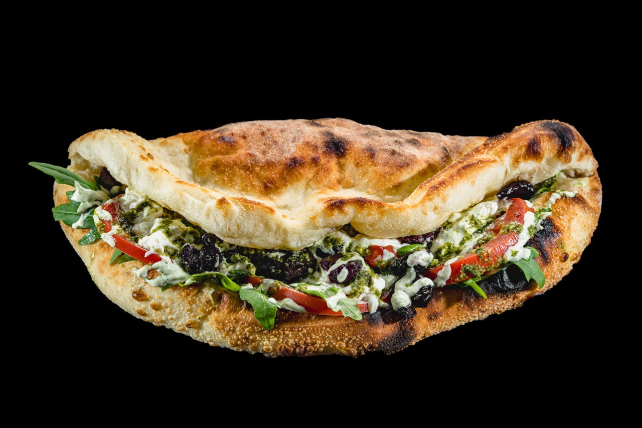 Соус песто, соус Айоли с зеленью, печёный помидор, вяленые маслины, шпинат, руккола, сыр страчателла, чесночное масло.